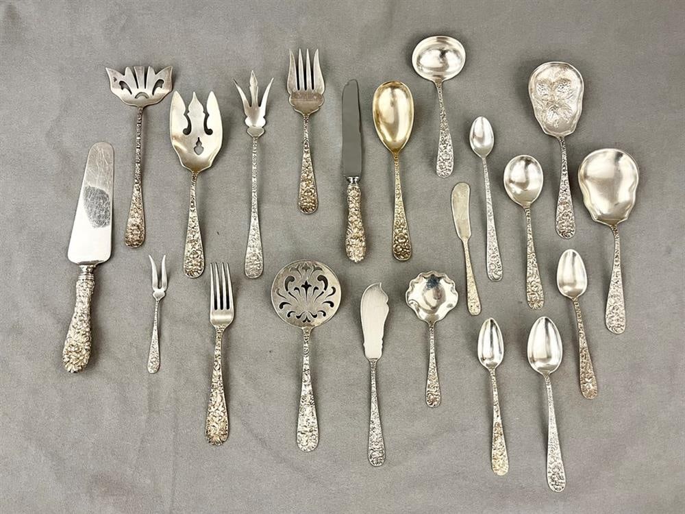 93-PIECE PARTIAL SERVICE STIEFF CO. "ROSE" PATTERN STERLING SILVER FLATWARE,