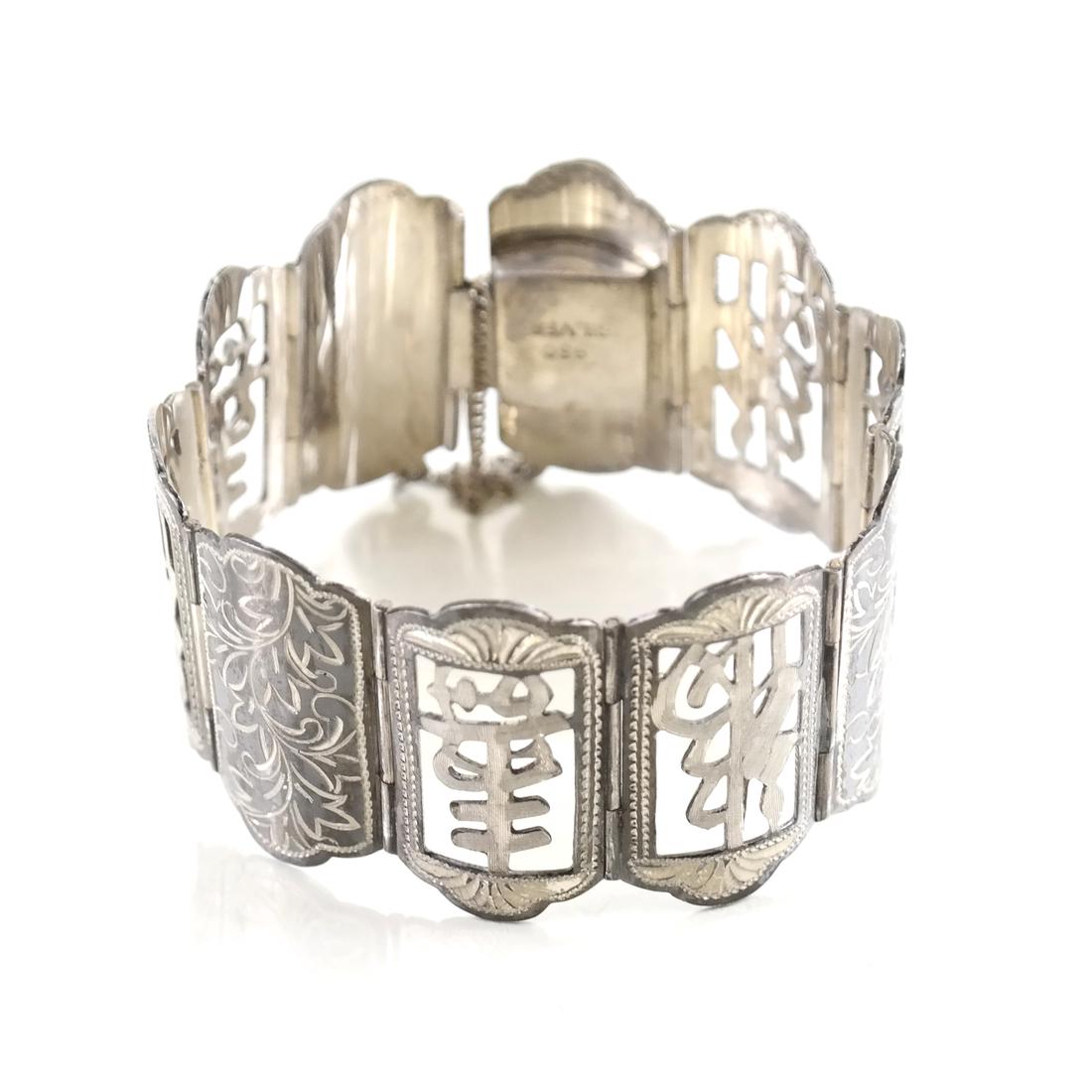 SoldChinese Vermeil Sterling Silver Filigree Bracelet20th century Chinese export handcrafted gold vermeil sterling silver wire filigree bejeweled 4 panel link bracelet with amethyst cabochons. Finished with open mouth and tongue closure. Retains it's saSee Sold Price