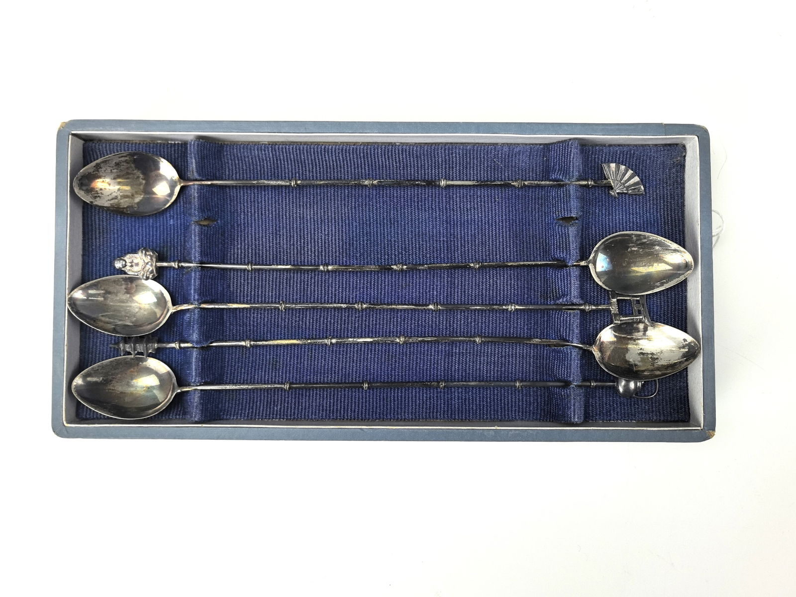 SoldThree Sets of Sterling Silver Tea or Cocktail SpoonsThree sets of sterling tea or cocktail spoons all of which have their own boxes and feature different designs. The first is a set of Sakai sterling cocktail spoons that feature a long handled simple dSee Sold Price