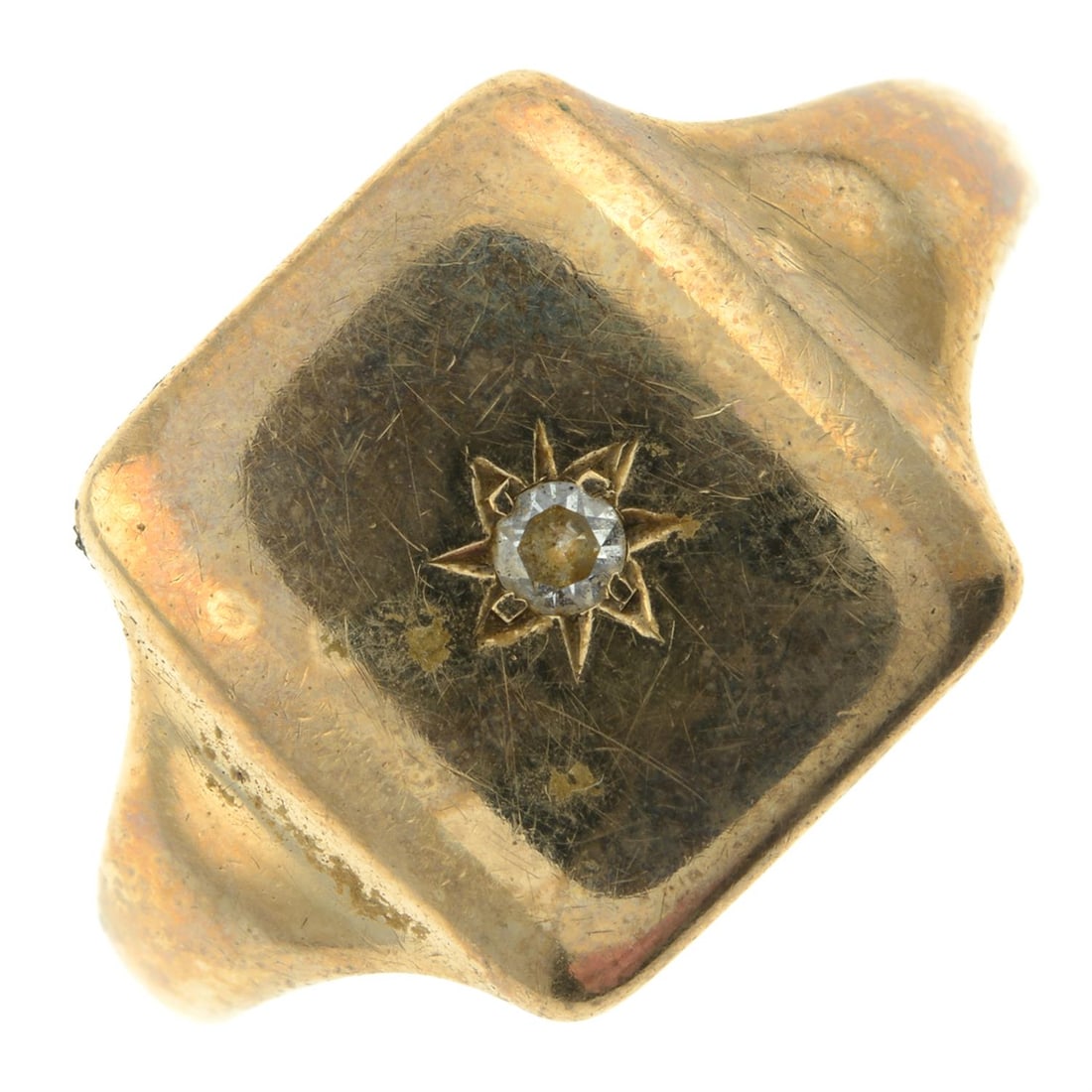 SoldA gents 9ct yellow gold and diamond signet ring theA gents 9ct yellow gold and diamond signet ring the bright-cut mount inset with a small Swiss-cut diamond, size S 1/2, 3.9 grams.See Sold Price