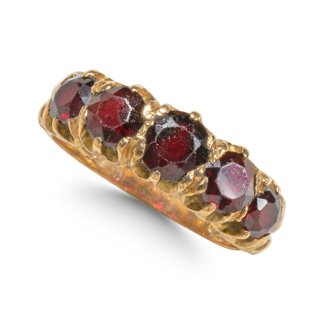 9CT YELLOW GOLD, FIVE STONE GARNET RING.
