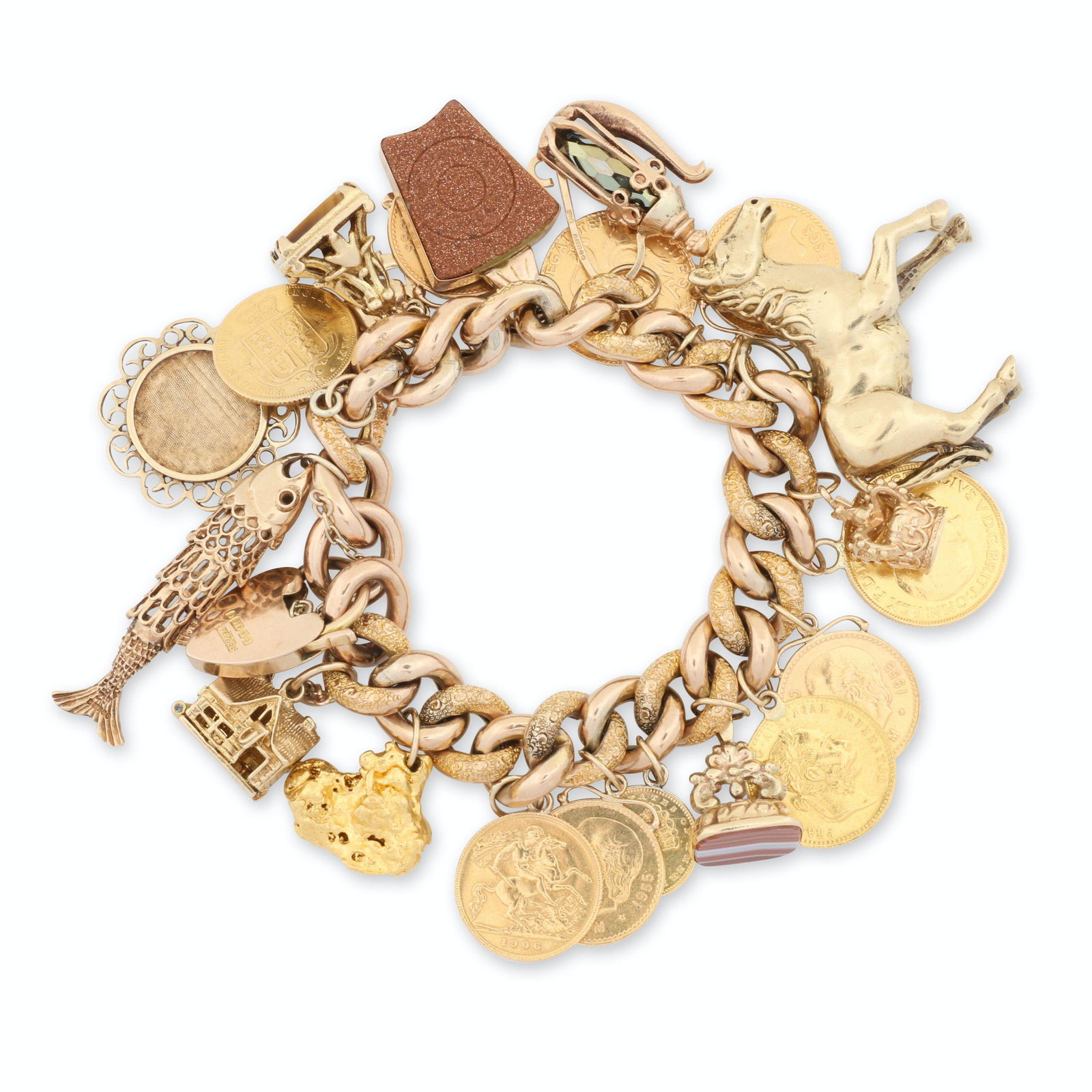 SoldEnglish 10k gold charm bracelet w/ 24 charms, 7.25"lEnglish 9k, 10k and 14k gold charm bracelet, having (24) charms, including a Victorian hand form door knocker, a heart locket, a car, a candleholder, an ankh, a whistle, an anchor, a 1909 Edward VII 1See Sold Price