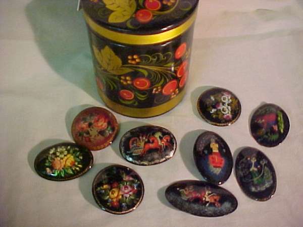 9pc RUSSIAN LACQUER PAINTED PINS CANISTER