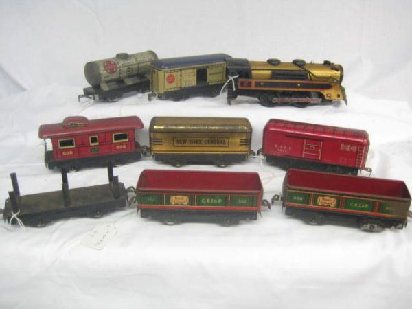 Soldlot of 6 Marx Tin Train Cars & Engine/ othersengine untested and is not marked, soe cars not marked but could possibly be Marx, all have wear, a lot of scratches and use, probably O gaugeSee Sold Price