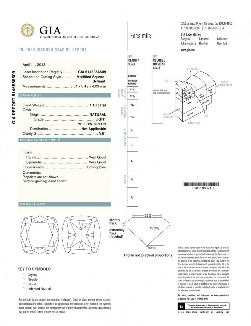 A 1.1CT LIGHT YELLOW GREEN CUSHION SHAPE CERTIFIED