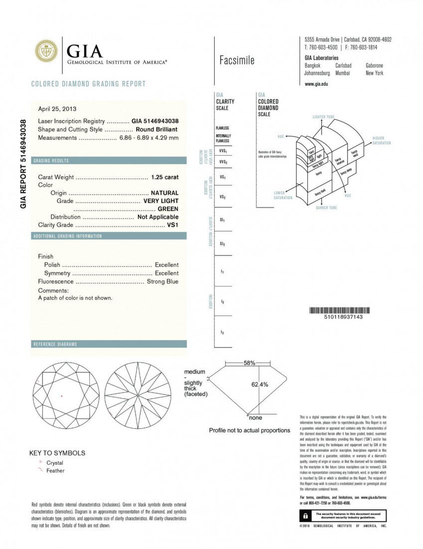 A 1.25CT VERY LIGHT GREEN ROUND SHAPE CERTIFIED VS1