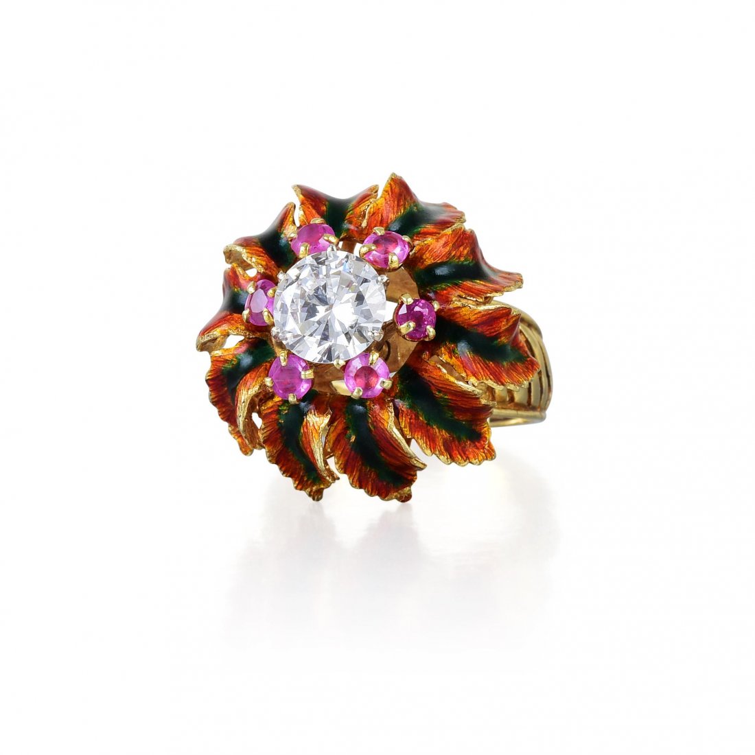 SoldRUBY, EMERALD, AND DIAMOND FLOWER BYPASS RINGRUBY, EMERALD, AND DIAMOND FLOWER BYPASS RING Containing one round mixed cut ruby, one round mixed cut emerald and 24 round brilliant cut diamonds weighing approximately 1.05 carats total. Mounted inSee Sold Price