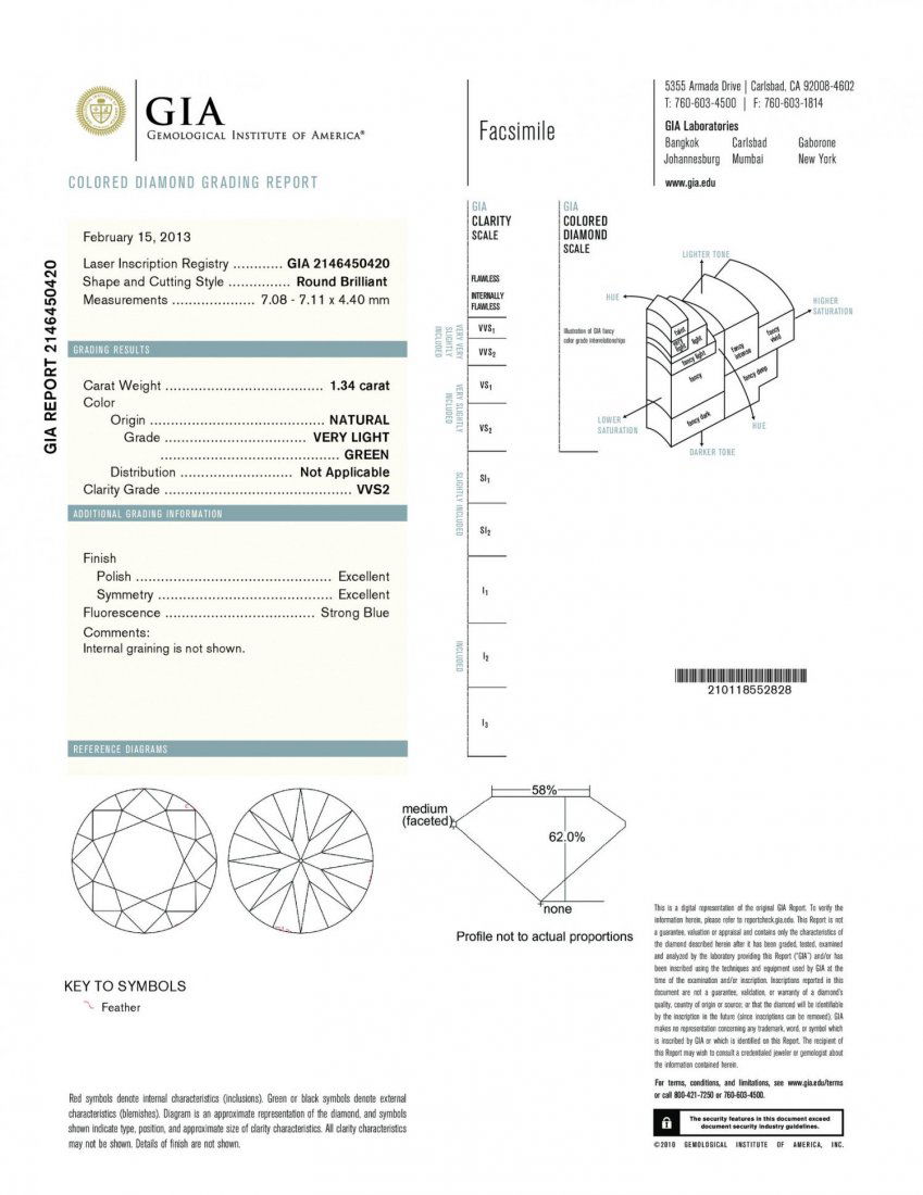 A 1.34CT VERY LIGHT GREEN ROUND SHAPE CERTIFIED VVS2