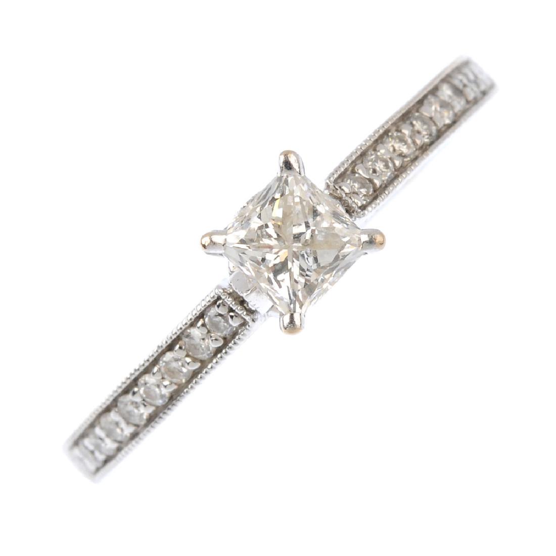 SoldAn 18ct gold diamond single-stone ring. TheAn 18ct gold diamond single-stone ring. The square-shape diamond, with tapered band. Estimated diamond weight 0.30ct, I-J colour, SI clarity. Hallmarks for London, 2010. Ring size N. Weight 3.9gms.See Sold Price