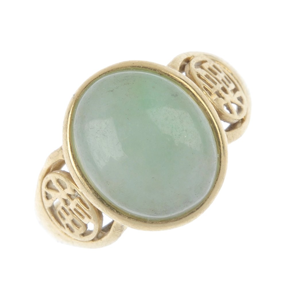 SoldA mid 20th century gold jade single-stone ring. TheA mid 20th century gold jade single-stone ring. The marquise-shape jadeite cabochon, to the plain band. Foreign marks. Ring size J. Weight 3.5gms. Jade untested. Overall condition fair to good. Some sSee Sold Price