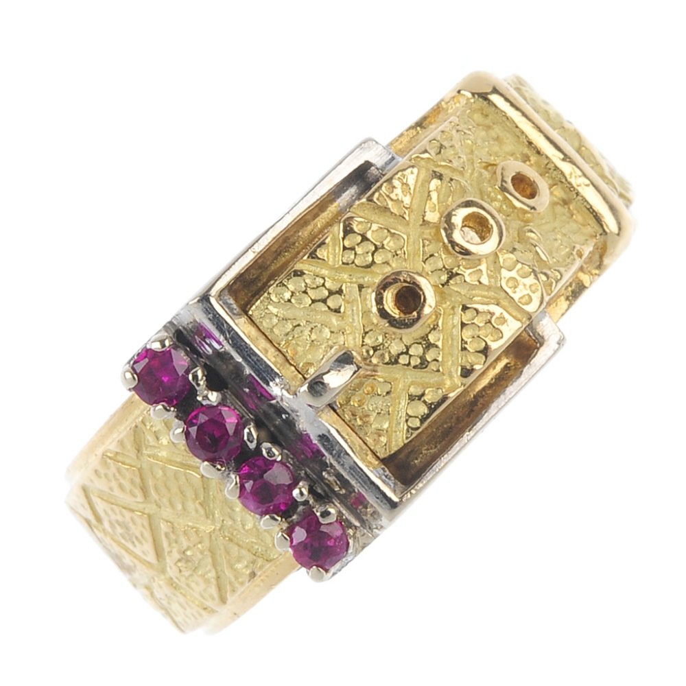 A 14ct gold synthetic ruby buckle ring. The band
