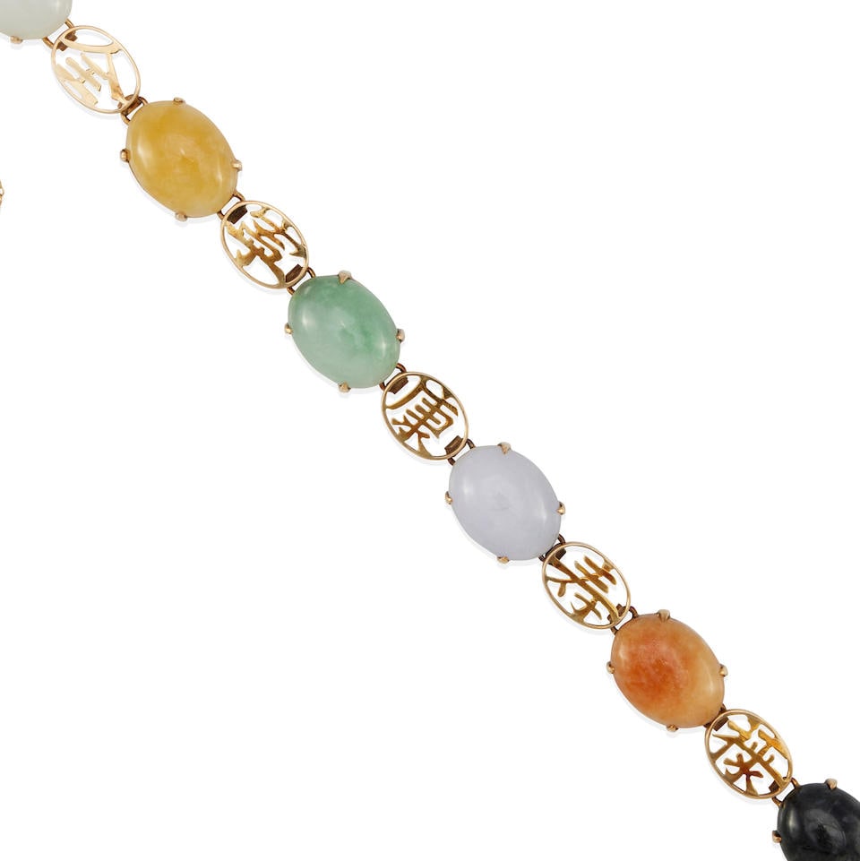 A 14K GOLD AND MULTI-COLORED JADE BRACELET