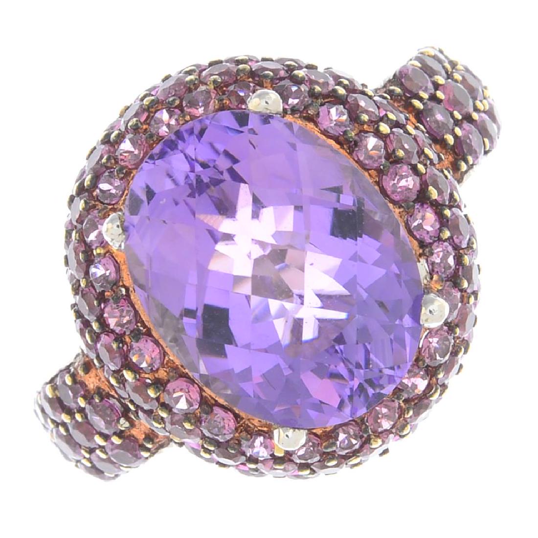 A 18ct gold amethyst cluster ring. The oval-shape