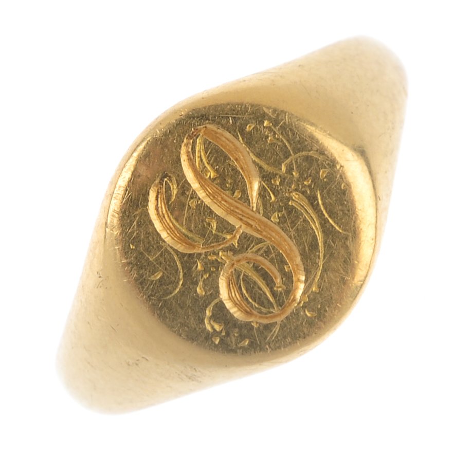 A 1920s 18ct gold signet ring. The circular-shape