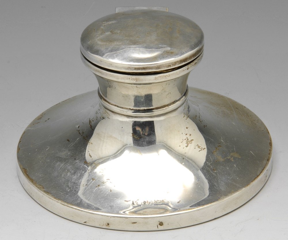 SoldA silver inkwell base of capstan form hallmarked Birmingham 1915, maker A. J. Pepper & Co. Approx.A silver inkwell base of capstan form hallmarked Birmingham 1915, maker A. J. Pepper & Co. Approx. 5" widePlease Note - we do not make reference to the condition of lots within descriptions. We are hoSee Sold Price