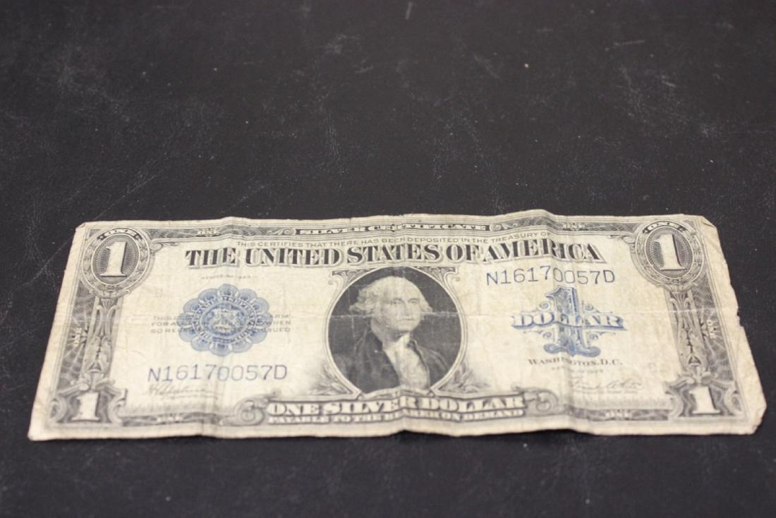 SoldU.S. $1.00 Blue Seal, Large NoteU.S. $1.00 Blue Seal, Large Note Series 1923, horse blanket style bill, featuring several folds including a piece of tape on the reverse, not professionally graded.See Sold Price