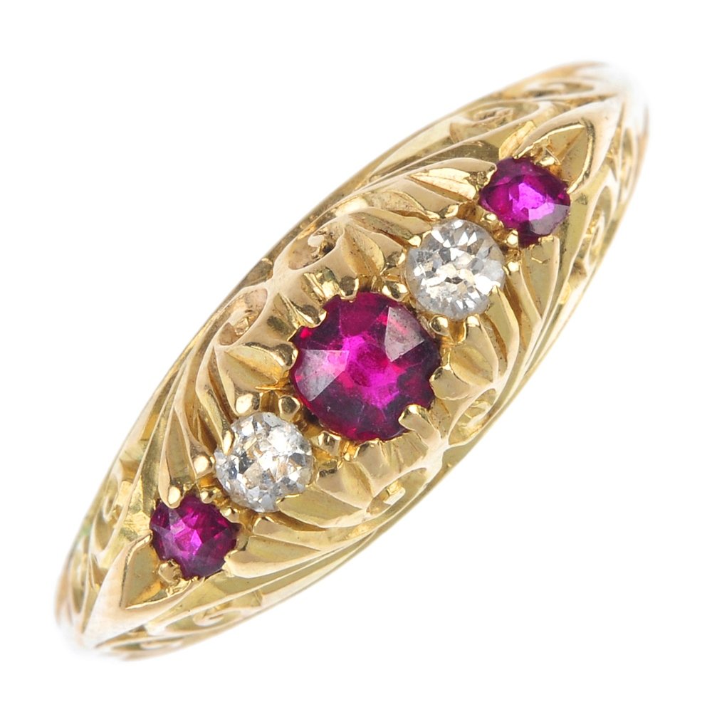 A 1930s 18ct gold ruby and diamond five-stone ring.