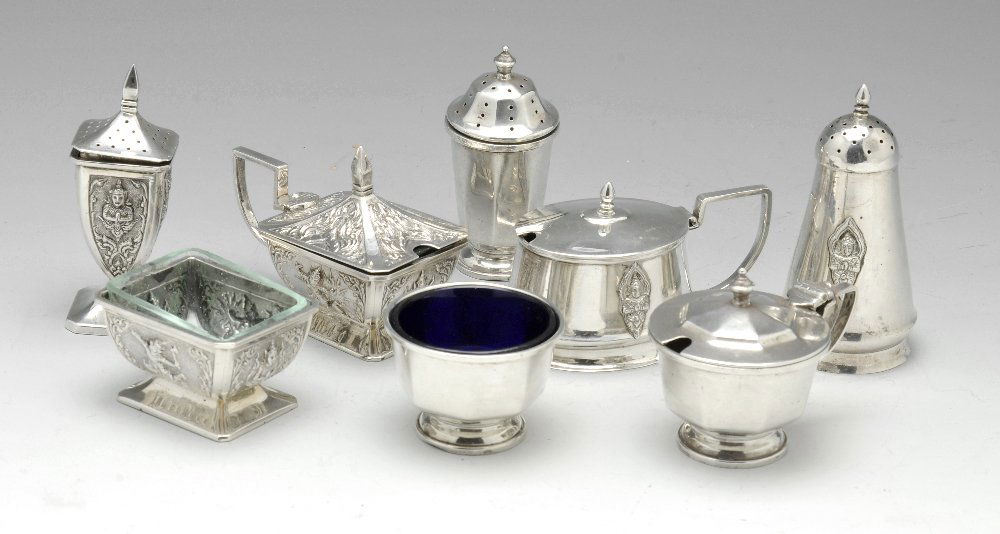 A 1940's silver three piece silver condiment, etc.