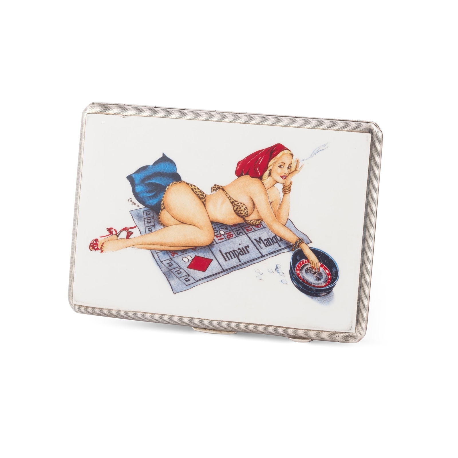 A 1940s enamel pin-up cigarette case