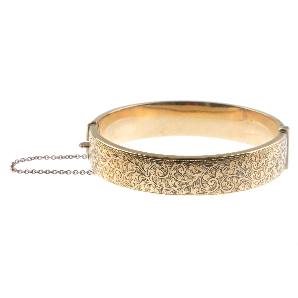 A 1950s 9ct gold hinged bangle. The front with scroll