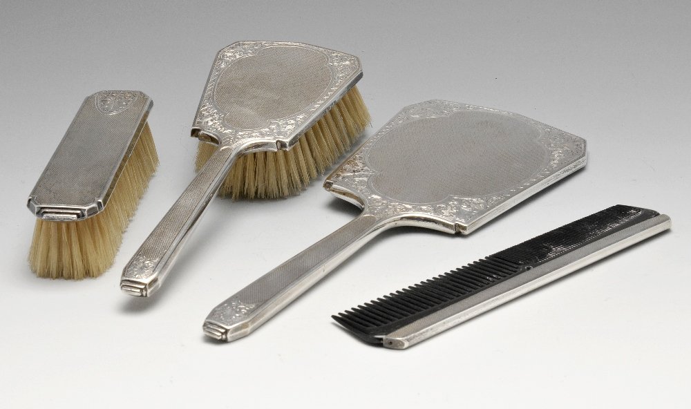 A 1960's silver mounted four piece dressing table set,