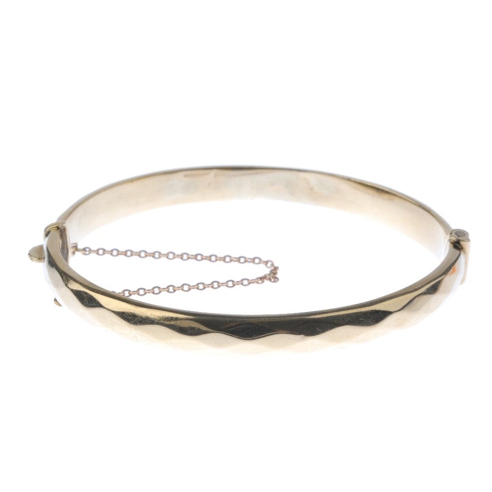 A 1960s 9ct gold hinged bangle. With faceted surface