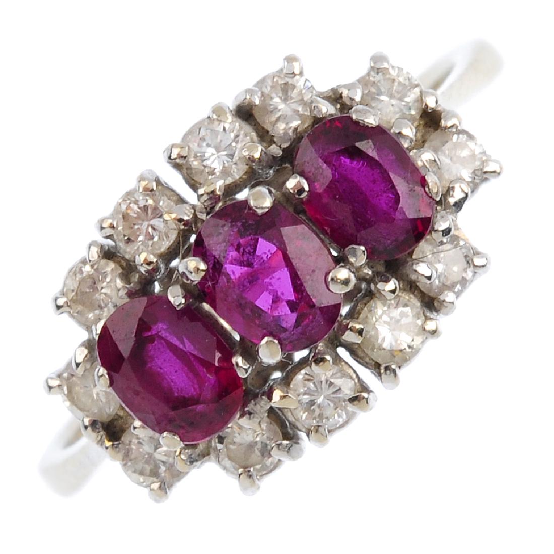 A 1970s 18ct gold ruby and diamond ring. The oval