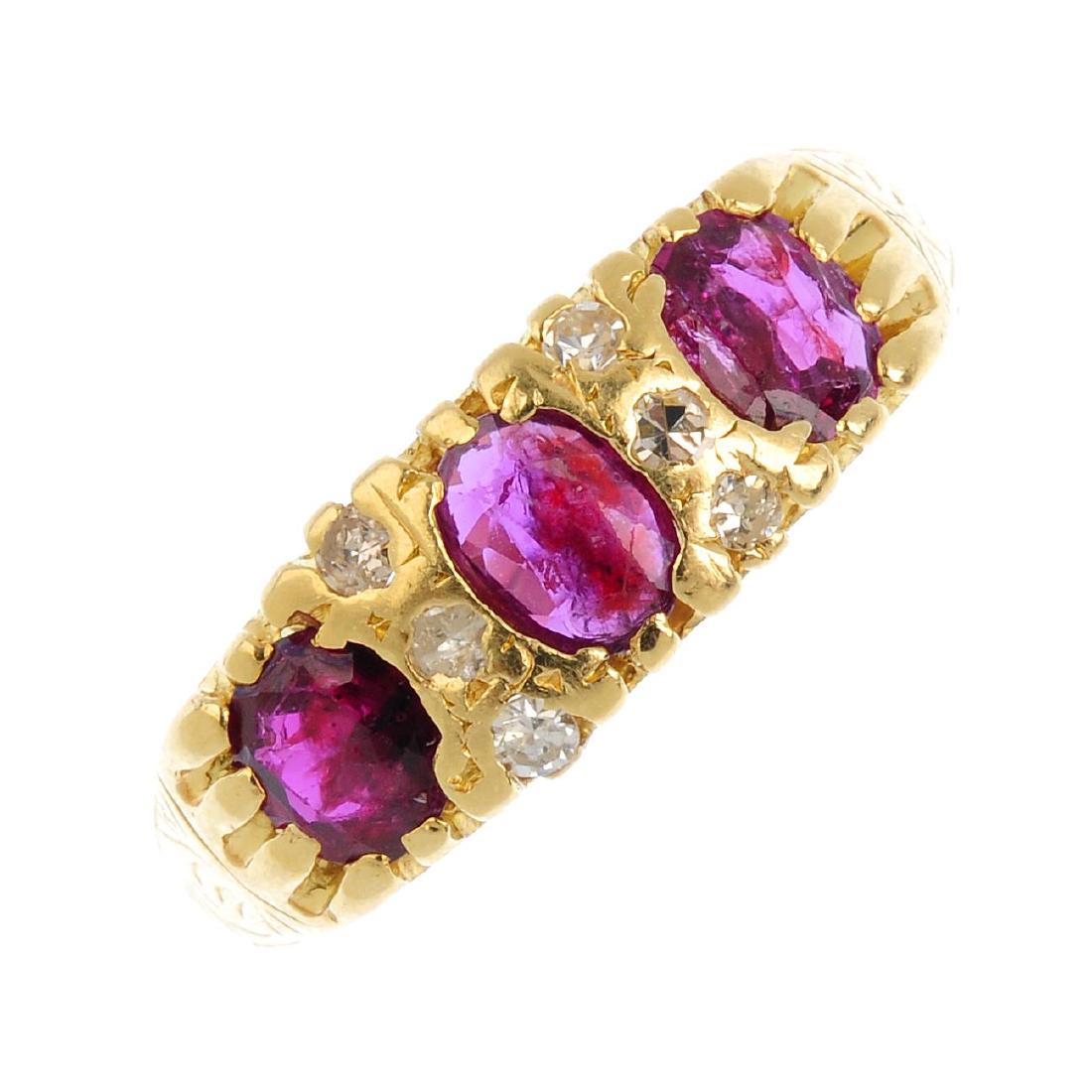 A 1970s 18ct gold ruby and diamond ring. The slightly