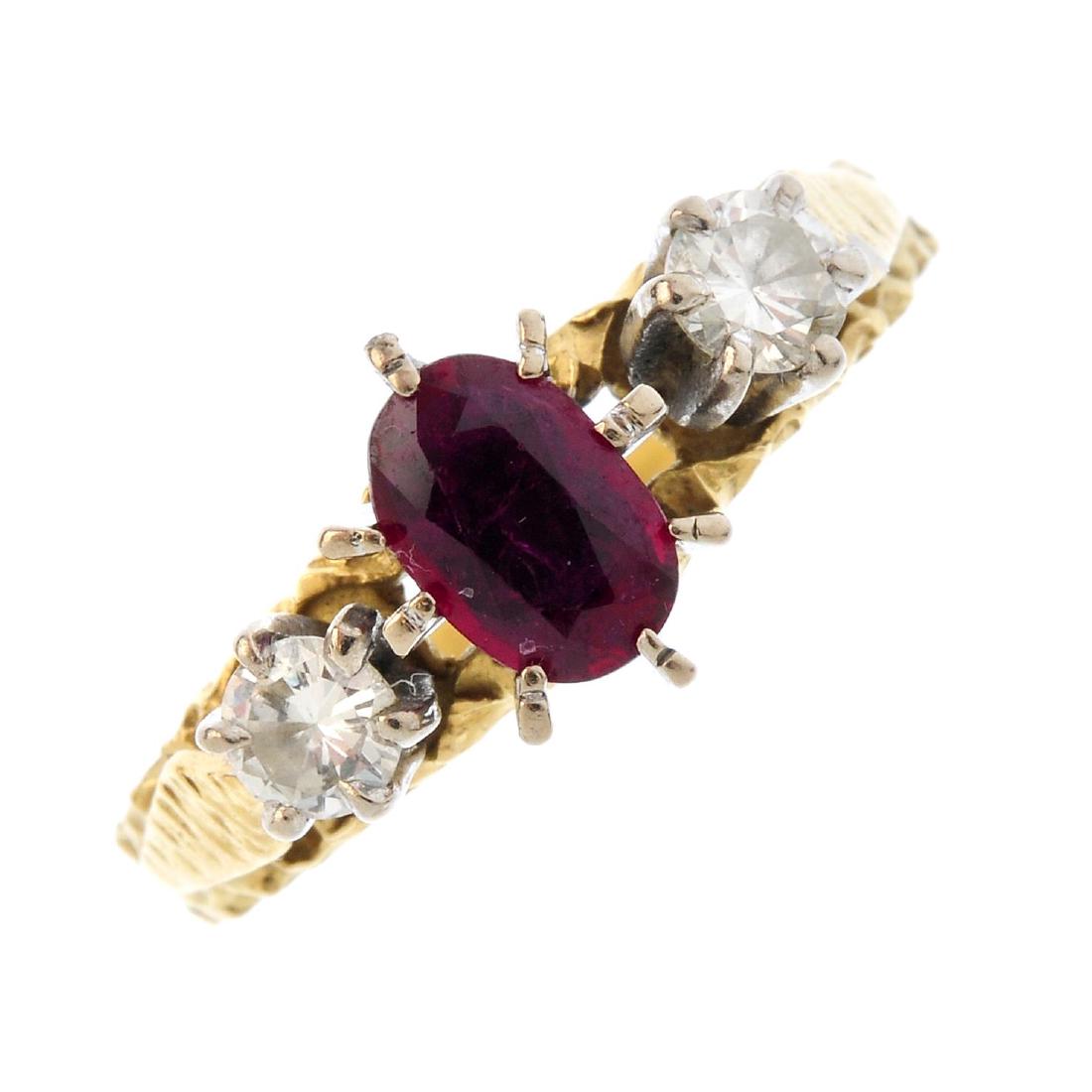 A 1970s 18ct gold ruby and diamond three-stone ring.