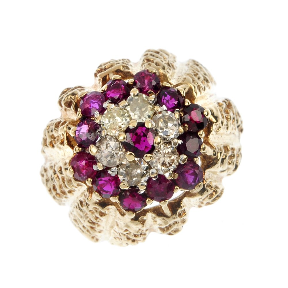 SoldA 1970s 18ct gold ruby and diamond cluster ring. TheA 1970s 18ct gold ruby and diamond cluster ring. The brilliant-cut diamond, with circular-shape ruby surround. Hallmarks for Birmingham, 1972. Ring size I. Weight 2gms.See Sold Price