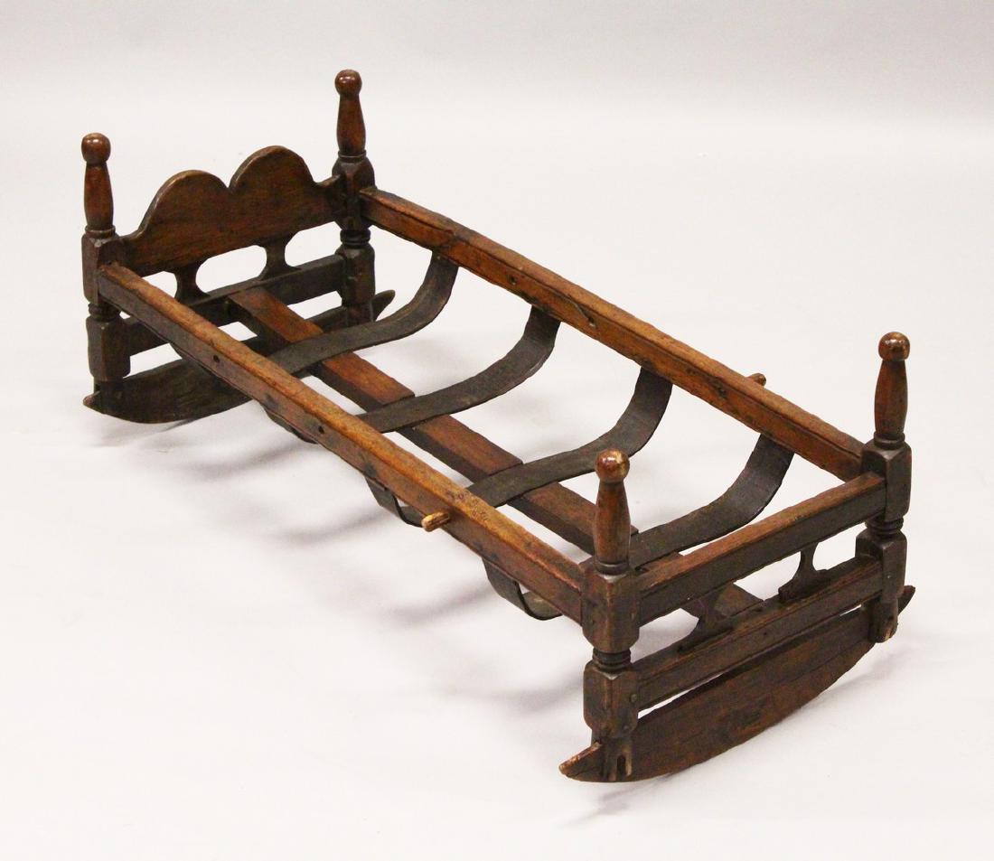 A 19TH CENTURY BEECH CRADLE, with pierced ends, turned