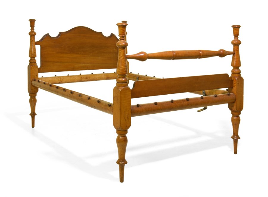 SoldAmerican Federal Tiger Maple Field BedAmerican Federal Tiger Maple Field Bed, first quarter 19th century, the segmented ring-turned posts supporting a single-board headboard, with shaped sides, h. 59", inside, w. 39", l. 72", outside, w.See Sold Price