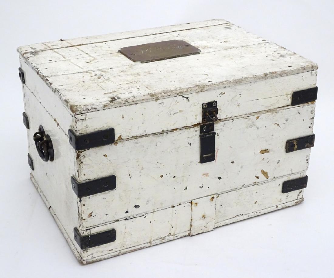 A 19thC painted pine chest / trunk having carry handles