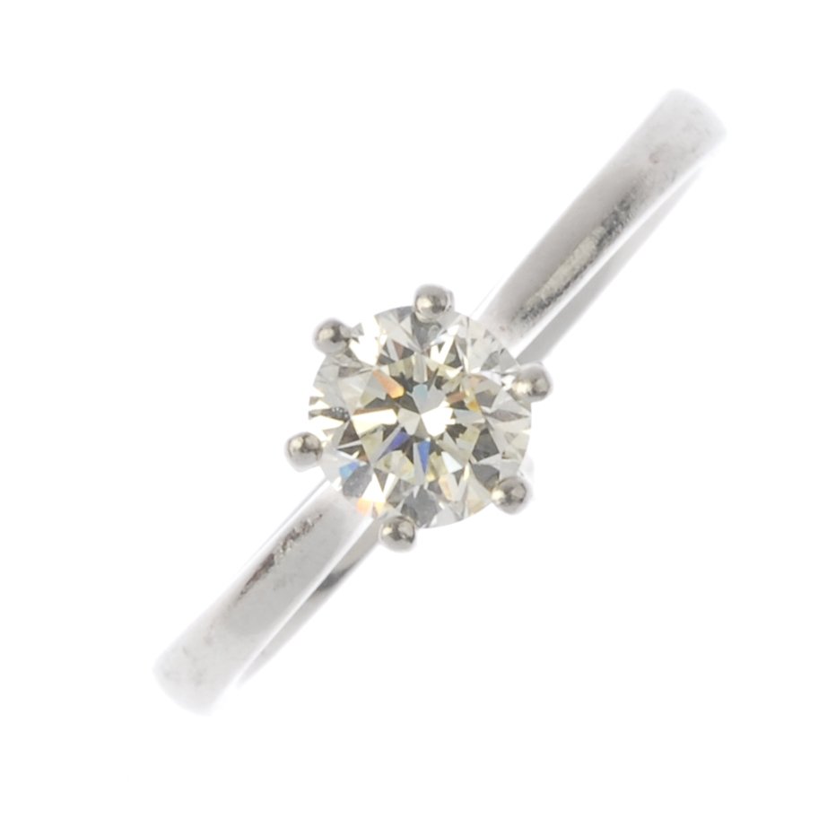 SoldAn 18ct gold diamond single-stone ring. TheAn 18ct gold diamond single-stone ring. The brilliant-cut diamond, with tapered shoulders. Estimated diamond weight 0.70ct, K-L colour, P2-P3 clarity. Hallmarks for Birmingham, 1997. Ring size N1/2. WSee Sold Price