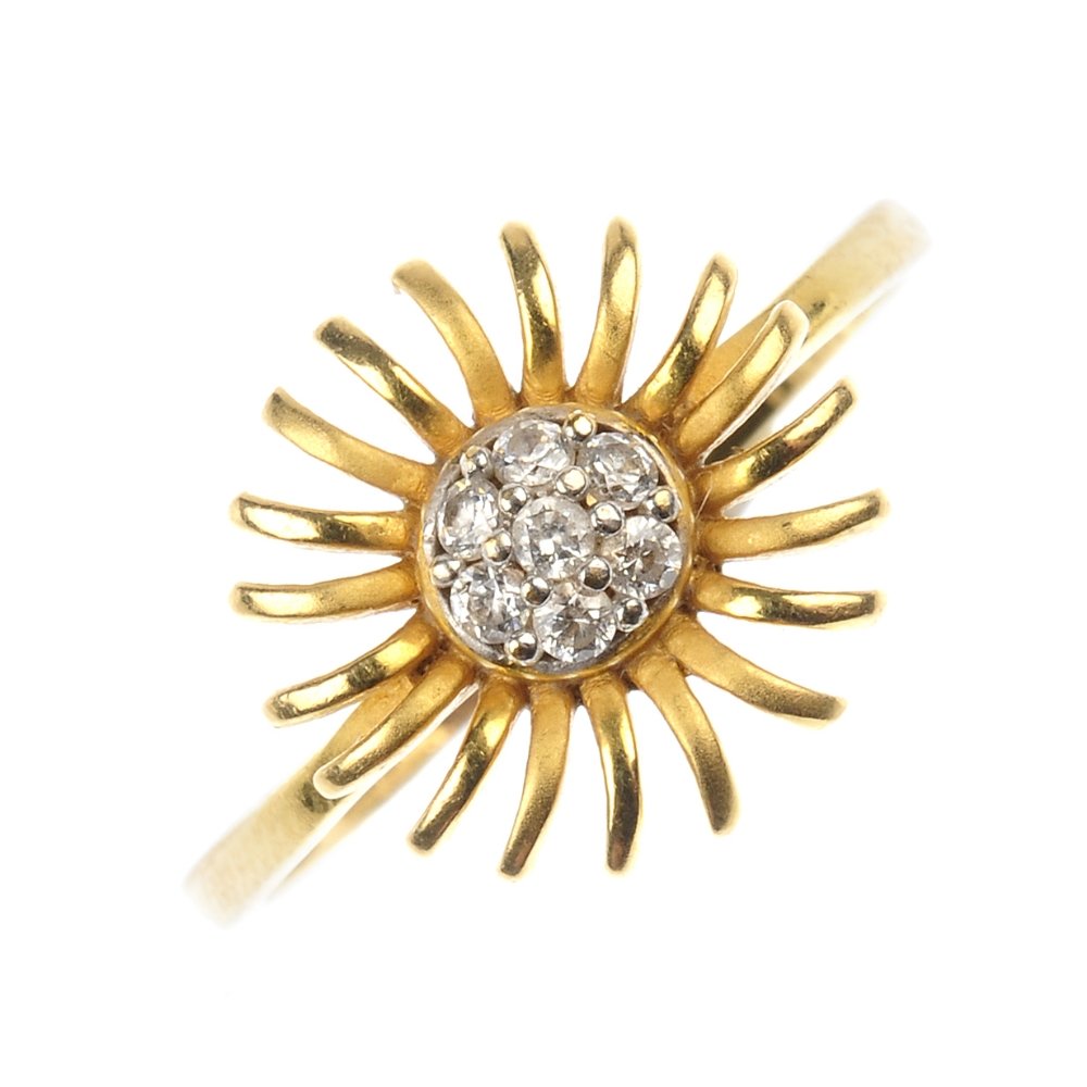 SoldFour 9ct gold diamond and gem-set rings. To include aFour 9ct gold diamond and gem-set rings. To include a diamond floral dress ring, two sapphire and diamond rings, together with a green paste and diamond ring. Estimated total diamond weight 0.30ct. HaSee Sold Price