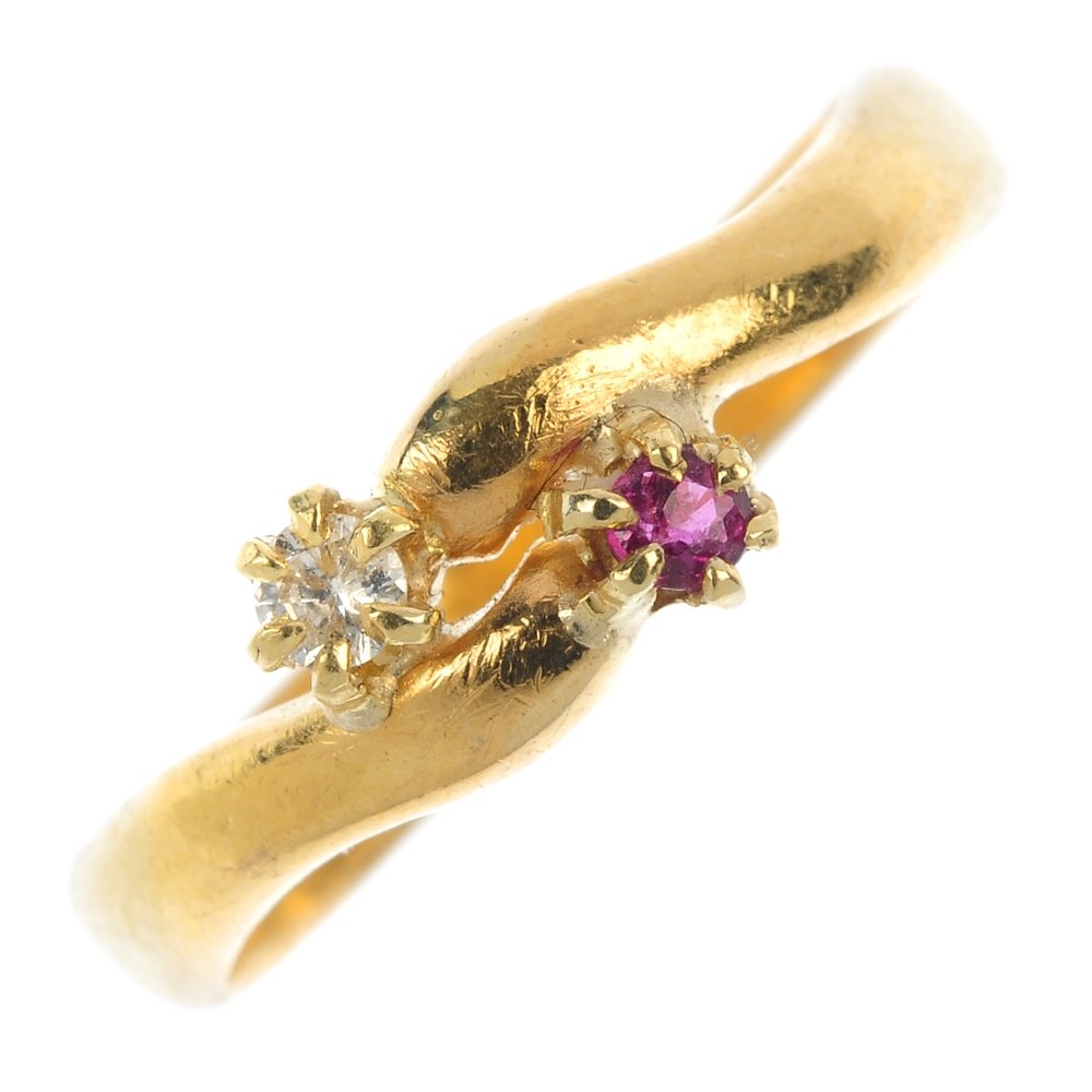 A 22ct gold ruby and diamond two-stone crossover ring.