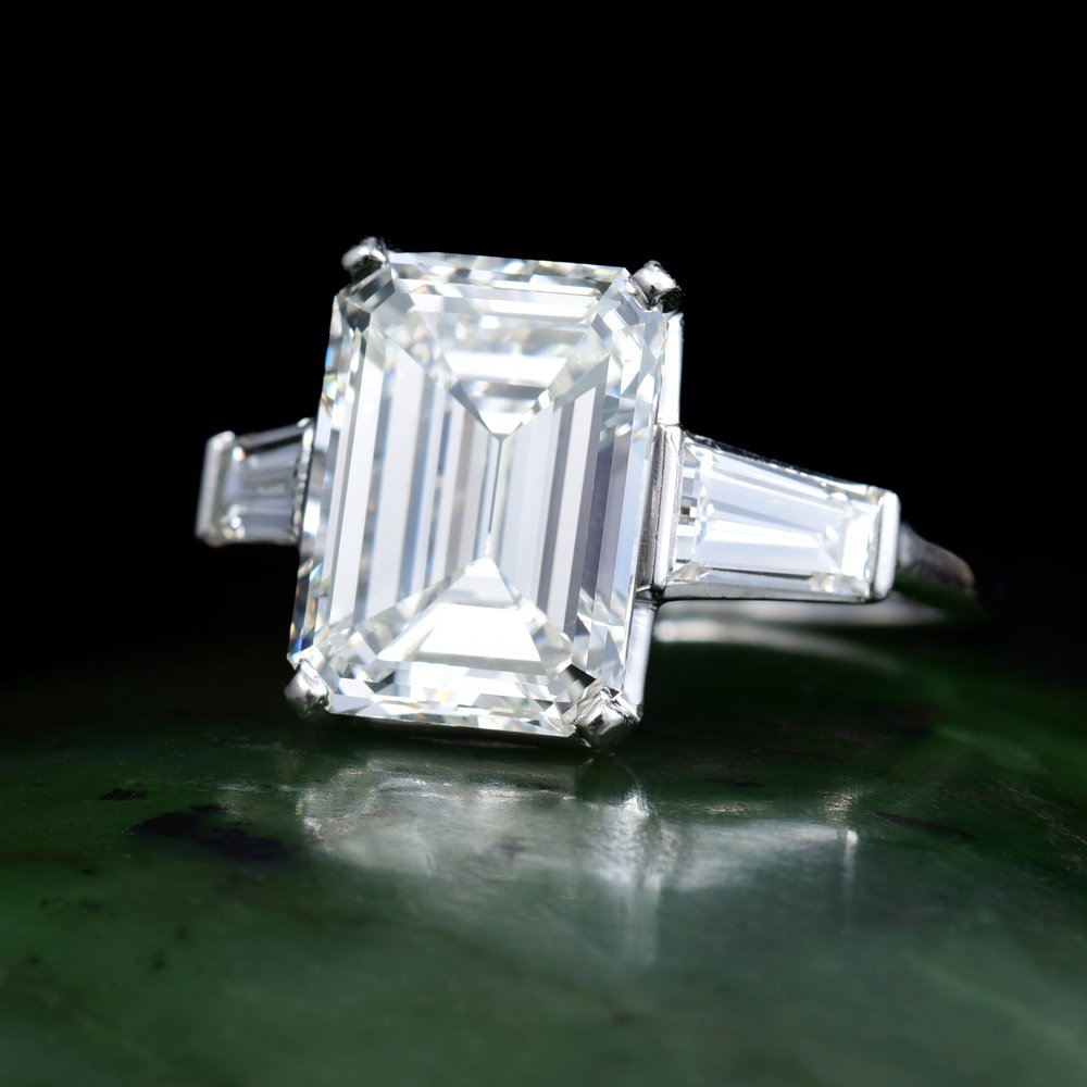SoldA 3.63 CARAT DIAMOND RINGSet with an emerald-cut diamond of 3.63 carats, decorated with circular-cut diamonds weighing 1.84 carats in total, accented with six baguette-cut diamonds of 1.07 carats in total, mounted in 18K goldSee Sold Price