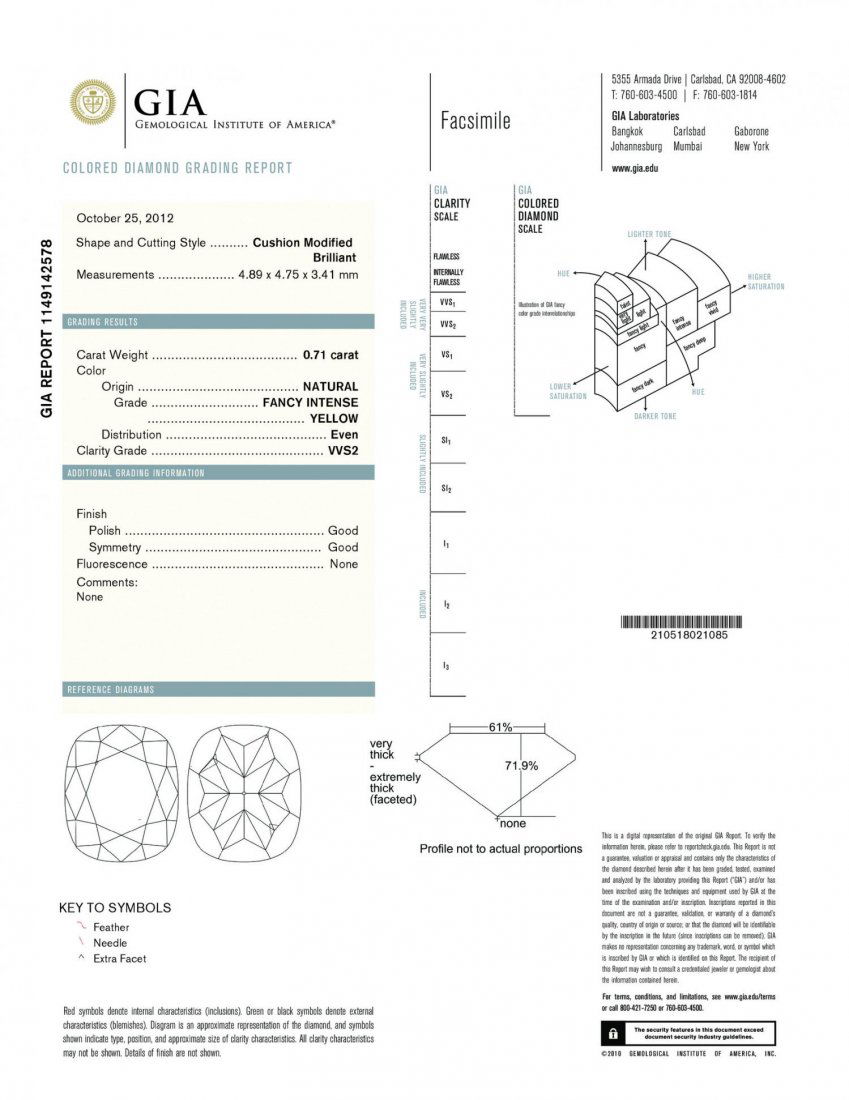 A .71CT FANCY INTENSE YELLOW CUSHION SHAPE CERTIFIED