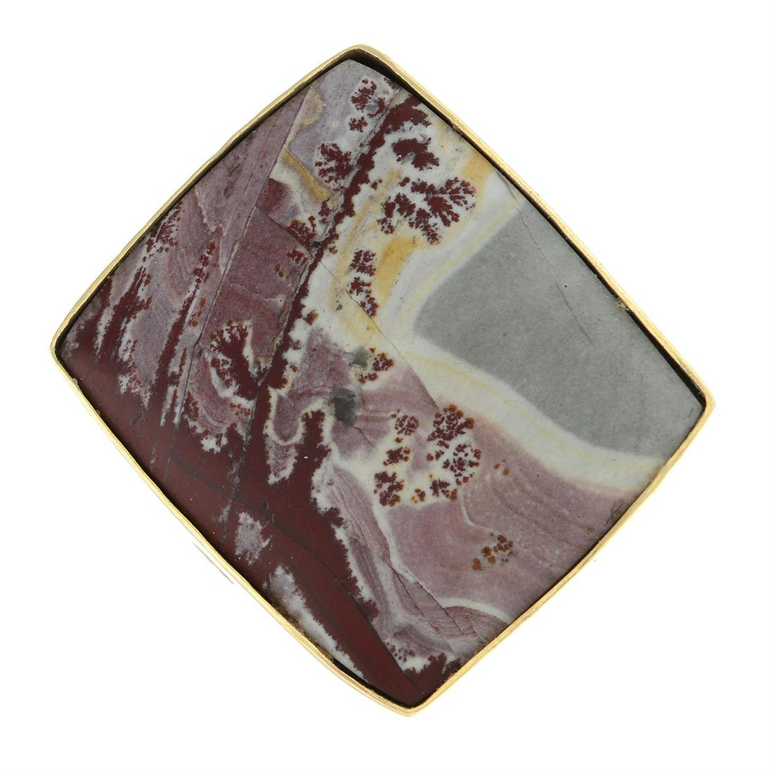 Sold14k Yellow Gold Agate Ring14k yellow gold men's signet style ring bezel set with a panel of "landscape" agate. Faded 14k mark along the interior shank. With a Dayton's box.Ring size: 9 US. Gross weight: 9.4 g.See Sold Price