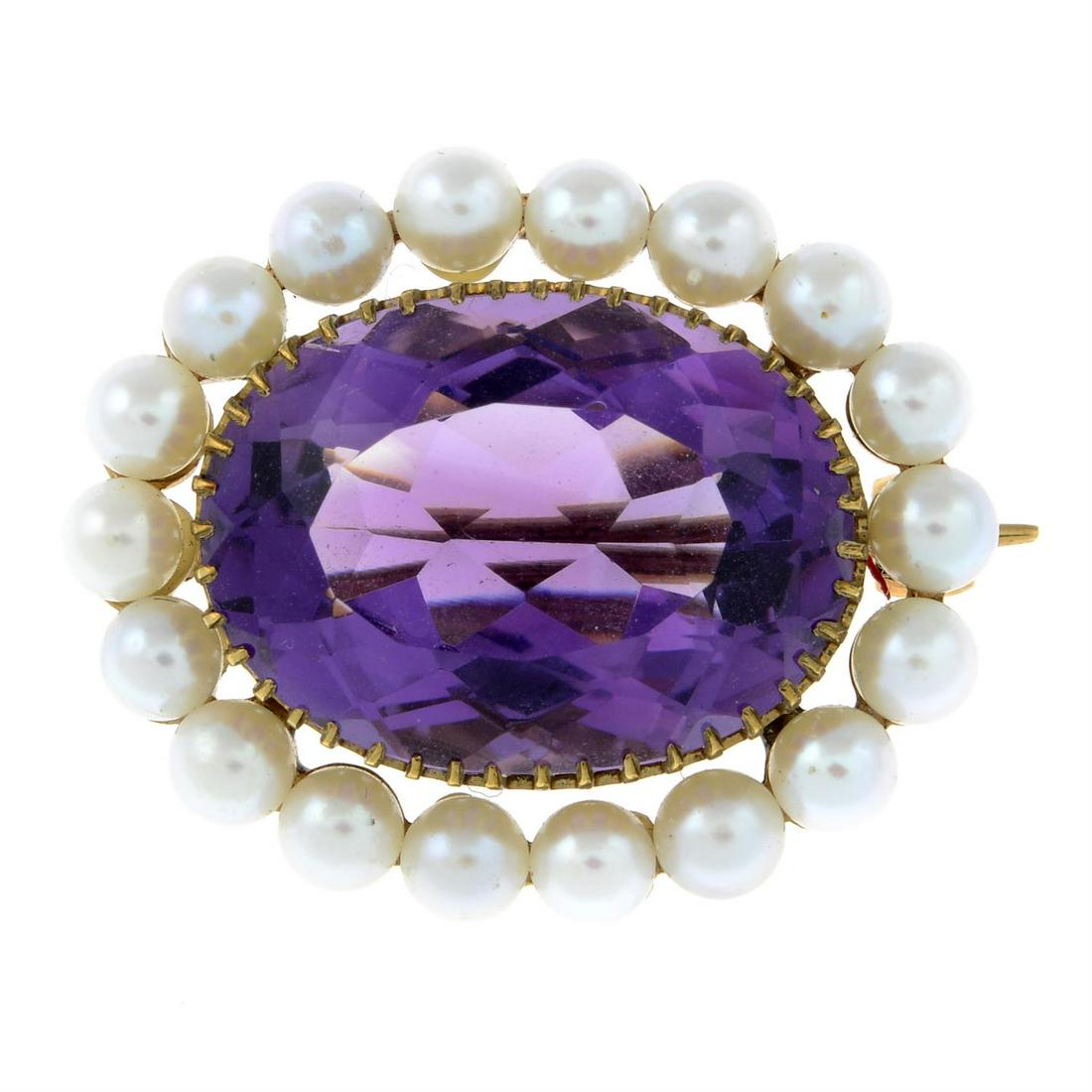 A 9ct gold amethyst and split pearl brooch.