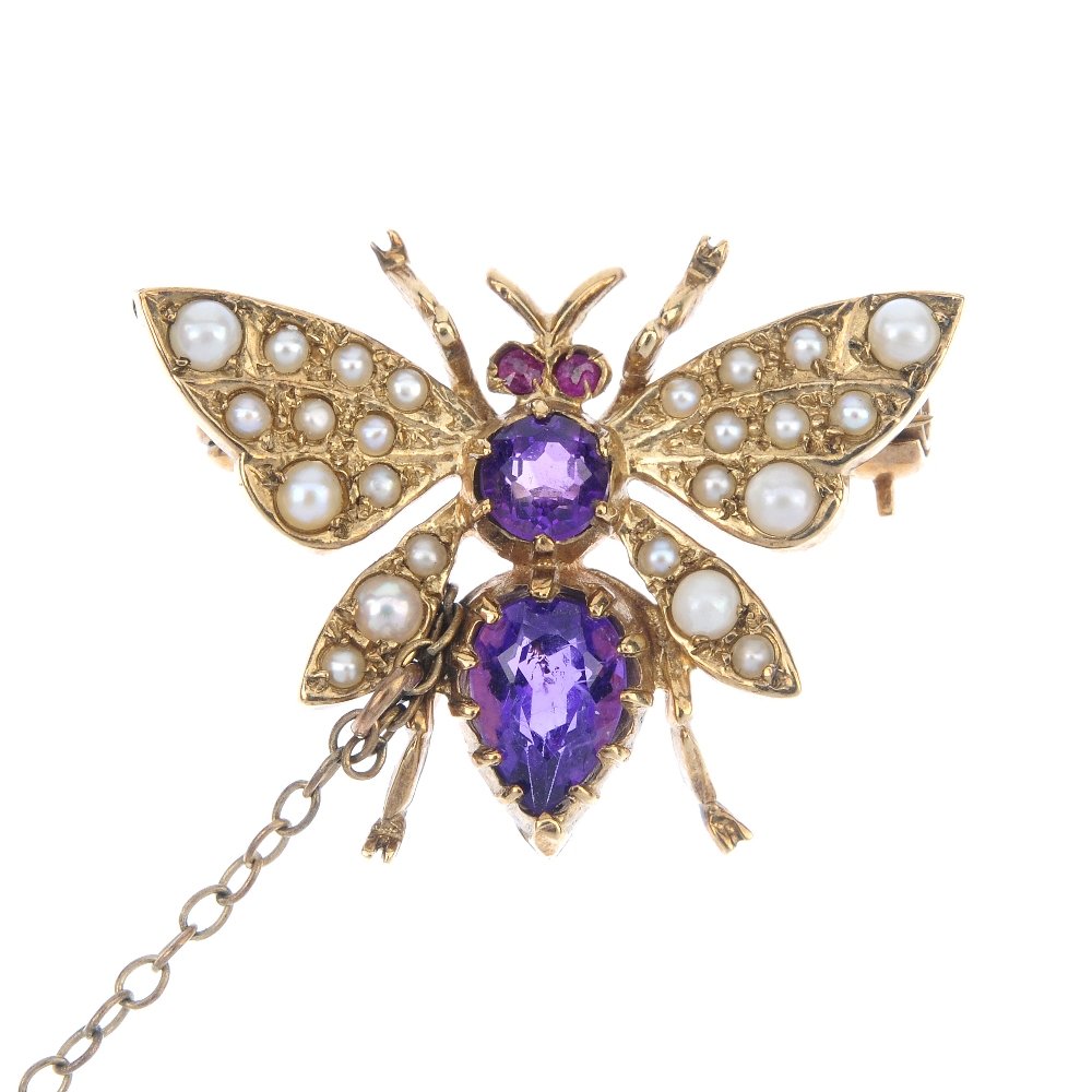 A 9ct gold amethyst, ruby and split pearl butterfly