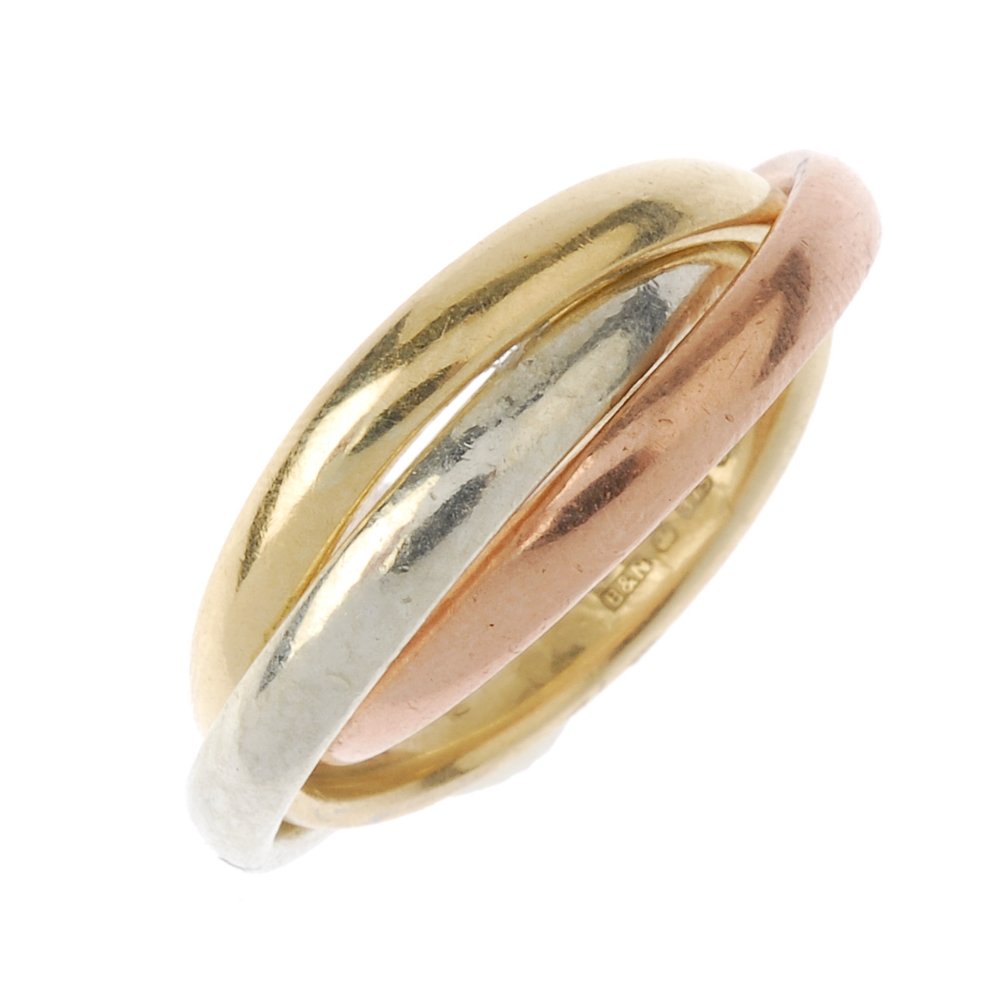 A 9ct gold band ring. Comprising three, tri-colour,