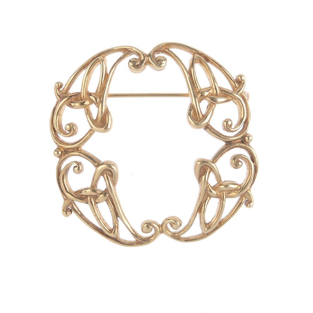 AN ANTIQUE EDWARDIAN PERIDOT AND PEARL BROOCH / PENDANT in 9ct yellow gold, the scrolling openwor...AN ANTIQUE EDWARDIAN PERIDOT AND PEARL BROOCH / PENDANT in 9ct yellow gold, the scrolling openwork body set with a round cut peridot accented by pearls, suspending a pear cut peridot drop, stamped 9ct