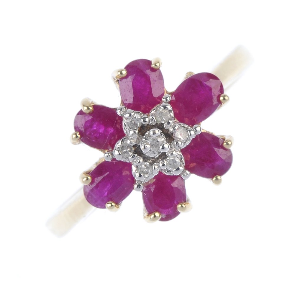 SoldA 9ct gold ruby and diamond floral cluster ring. TheA 9ct gold ruby and diamond floral cluster ring. The single-cut diamond cluster, within an oval-shape ruby petal surround. Hallmarks for Birmingham. Ring size L. Weight 2.6gms.See Sold Price
