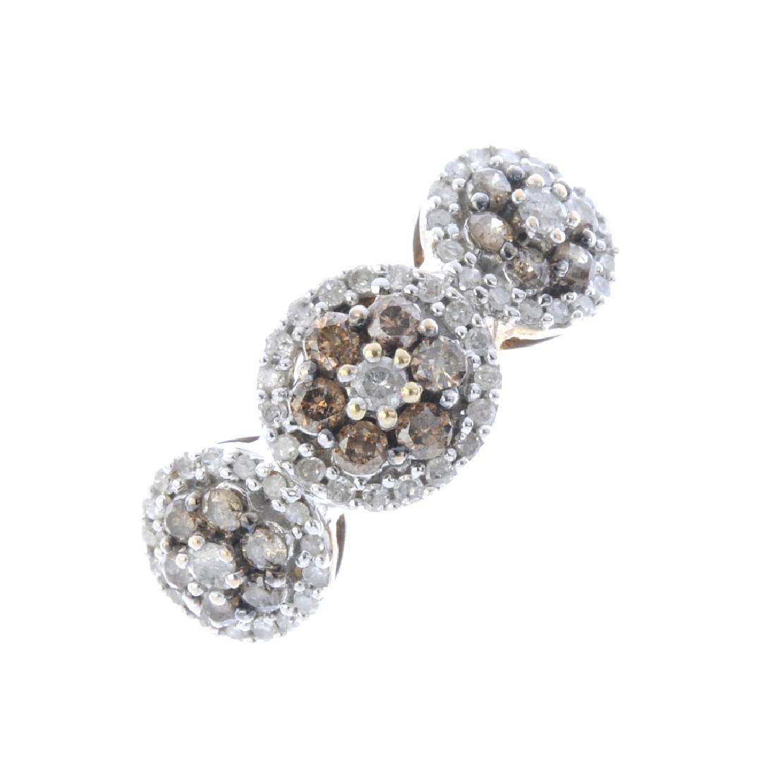 A 9ct gold diamond triple-cluster ring. Designed as a