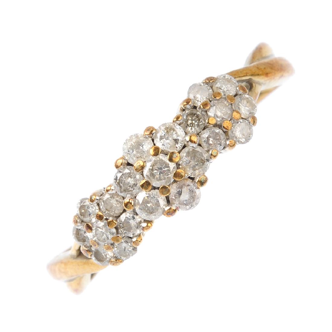 A 9ct gold diamond triple cluster ring. Designed as