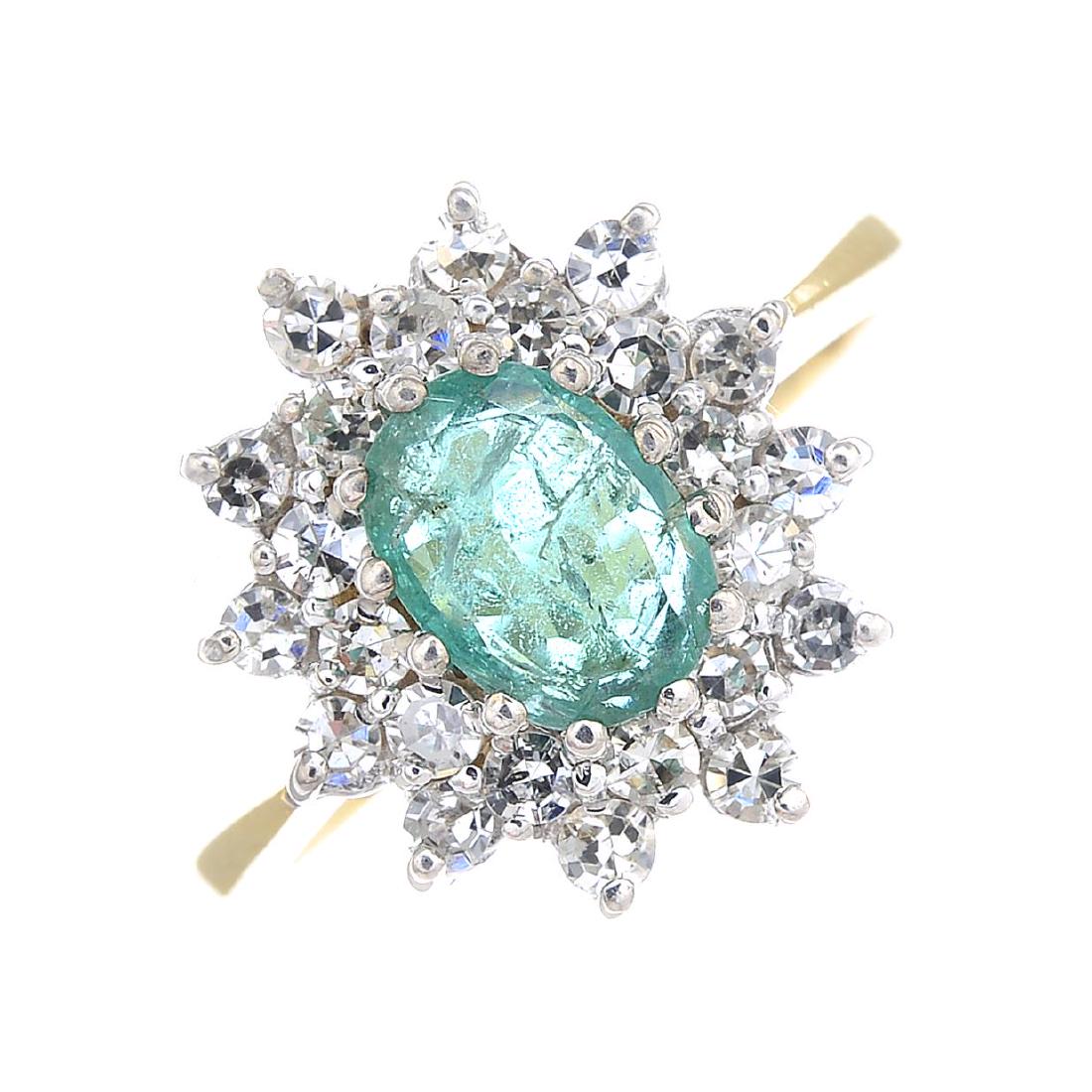 A 9ct gold emerald and diamond cluster ring.Emerald