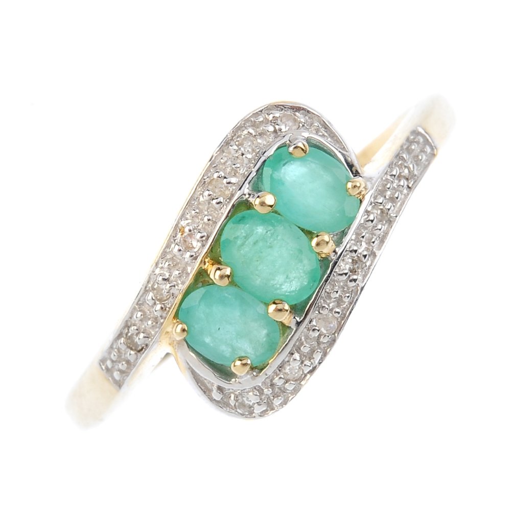 A 9ct gold emerald and diamond crossover ring. Designed