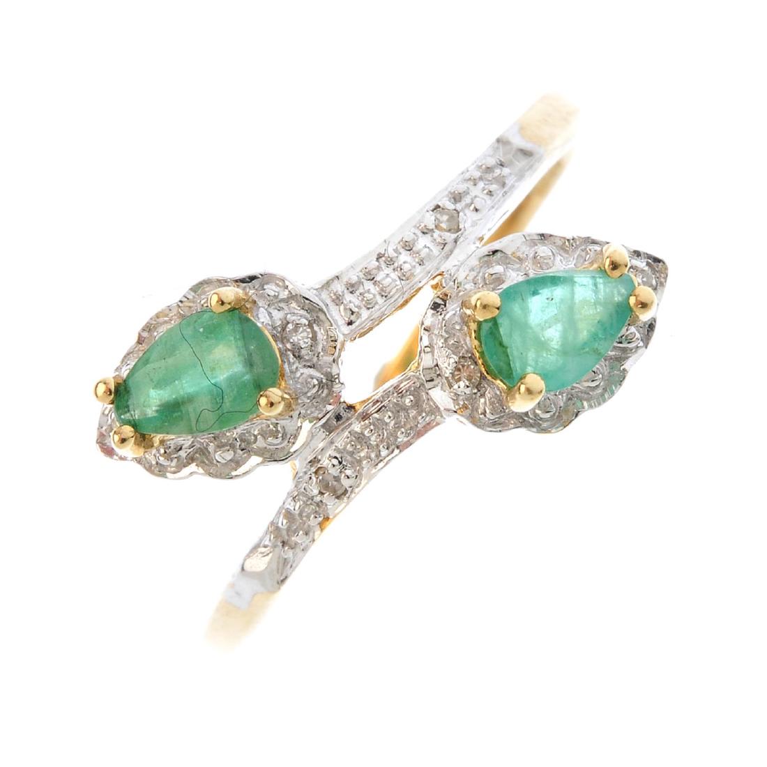 A 9ct gold emerald and diamond crossover ring. The