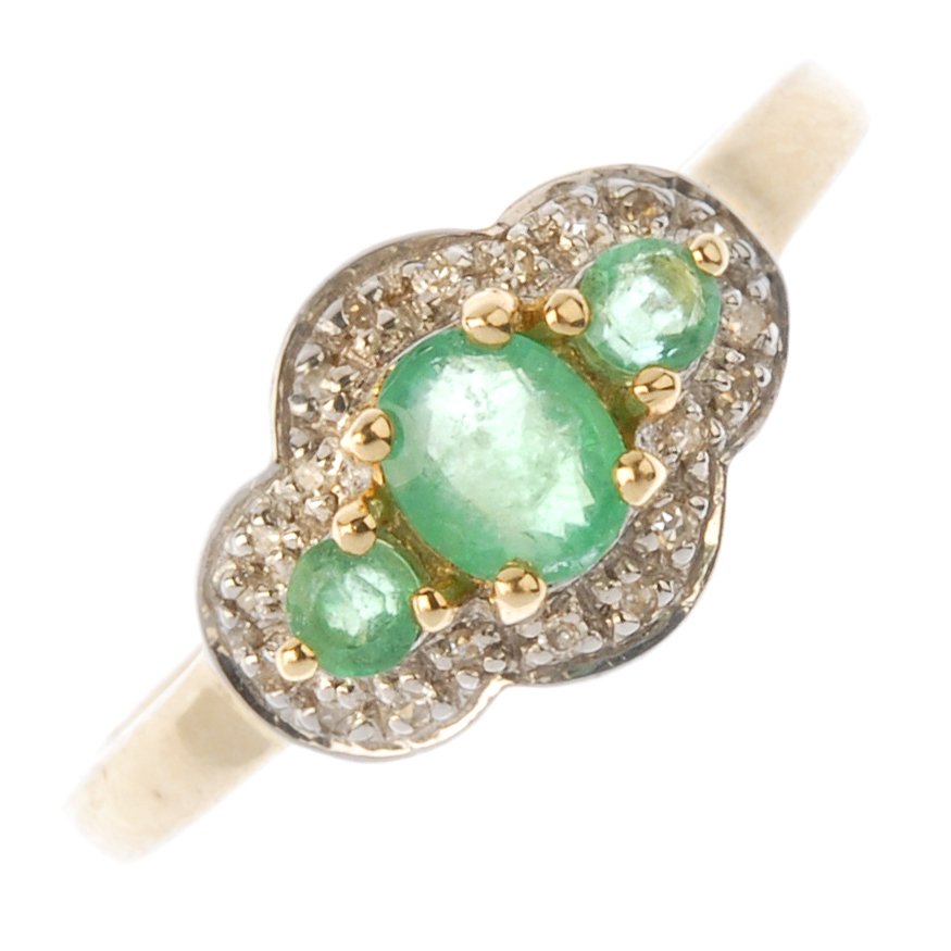A 9ct gold emerald three-stone ring. The oval and